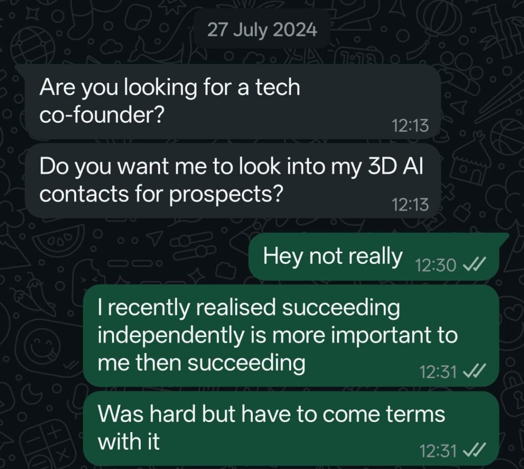 People keep asking the median questions about co-founders and market size. The truth is, this thing I’m building is too personal to share right now.
